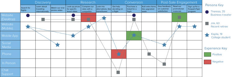 Voici deux exemples d’approches qui cartographient toutes les étapes de l’expérience client, suivi d’un exemple de cartographie vierge pour vous aider.